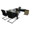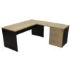 Conjunto Ejecutivo que consta de un escritorio con corte ergonómico con base metálica de importación y faldón perforado, puente unión, credenza rectangular con pedestal integrado de 3 cajones: 2 papeleros, 1 de archivo en tamaño oficio con sistema de seguridad y archivo colgante y librero sobre credenza con hueco esquinero, 4 puertas de bandera y entrepaño papelero inferior. Fabricado en melamina de diseño de 28 y 16mm con cantos en pvc rígido.