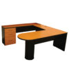 Conjunto Semi Ejecutivo que consta de un escritorio rectangular con base metálica de 4 puntos de 1 1/2″ y faldón melaminico, puente unión, credenza rectangular con pedestal integrado de 3 cajones: 2 papeleros, 1 de archivo tamaño oficio con sistema de seguridad y archivo colgante. Fabricado en melamina diseño de 28 y 16mm con cantos en pvc rígido.